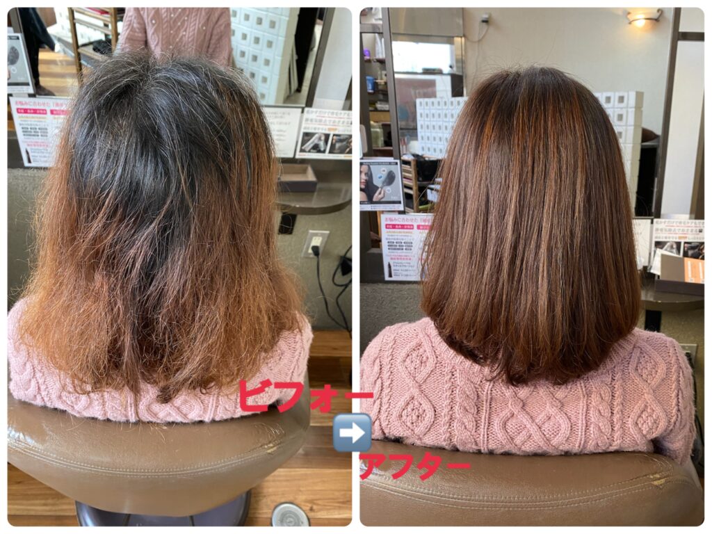 慣れないうちは大変な日もあったかと思いますが、根気よく続けていただくことで、写真のような元気な髪へと変化されました。