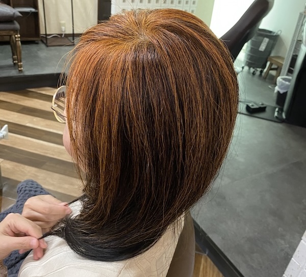 頭頂部の髪を明るめのカラーでハイライトのように染め、内側の髪はベースカラーと白髪をなじませるように染めていきます。