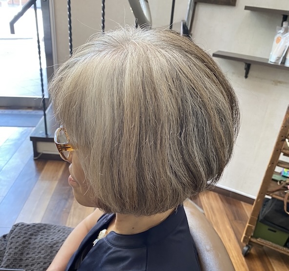白髪部分にハイライトが入ることで、白髪と黒髪の境界線を自然にぼかして全体的に明るく柔らかな印象に仕上がります。